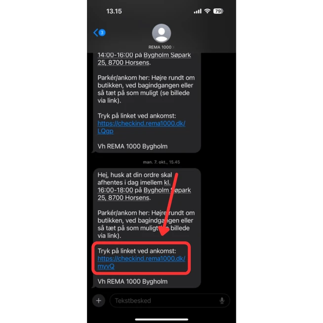 Kort tid før dit afhentningstidspunkt starter, vil du modtage en SMS med link i - tryk på linket ved ankomst til butikken.