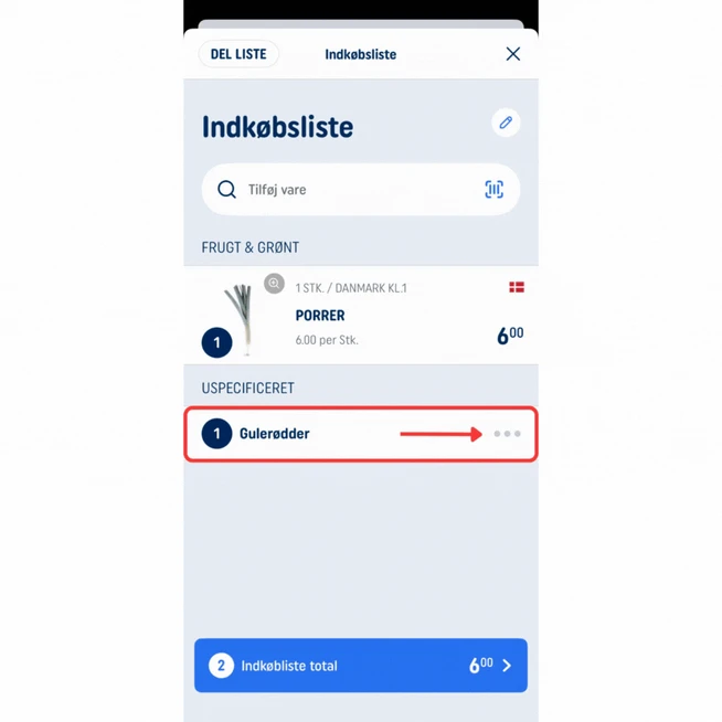 Uspecificerede varer betyder, at en eller flere varer på indkøbslisten ikke er valgt som konkrete varer. Disse varer vil fremgå på listen uden en pris på din indkøbsliste.