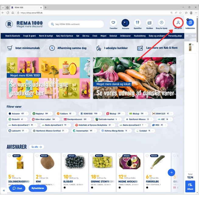 Tryk på "Min profil" øverst til højre på hjemmesiden.